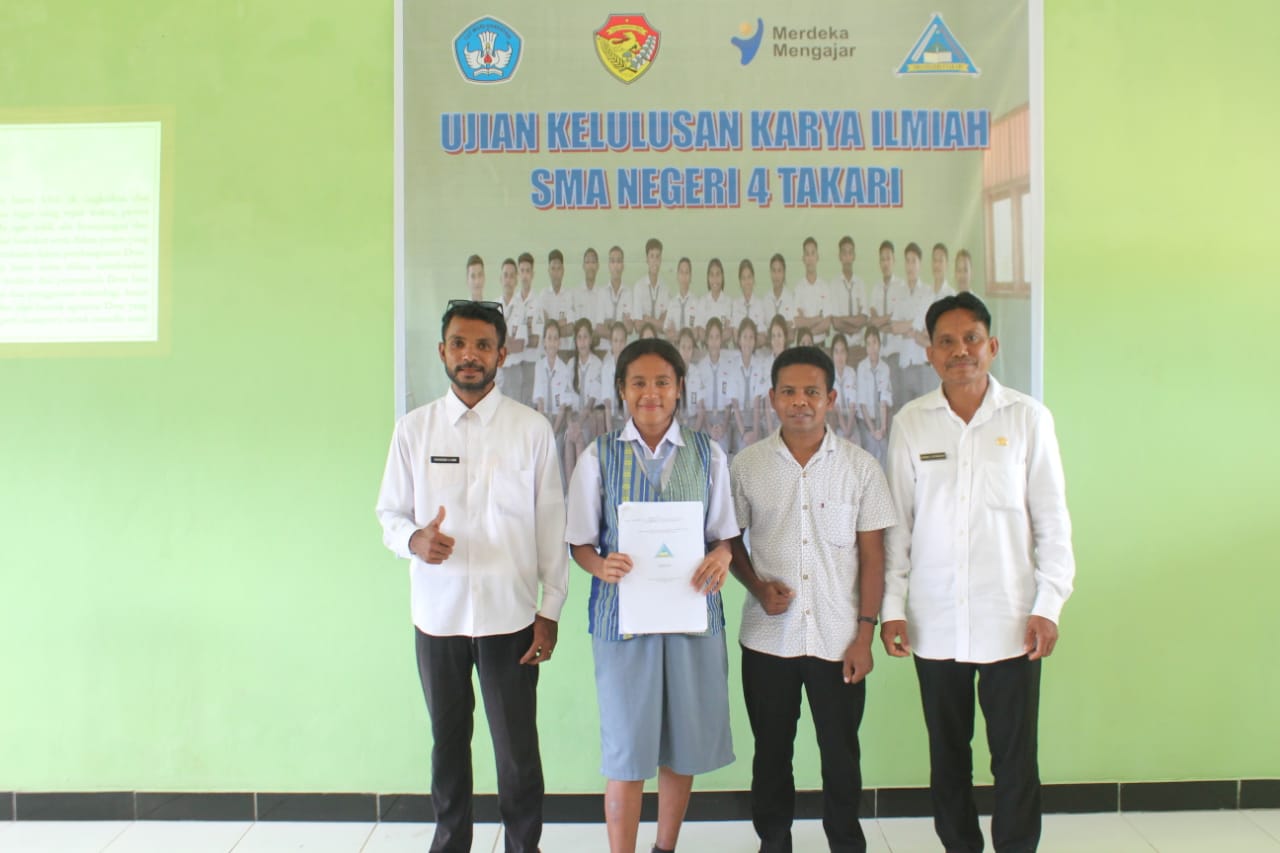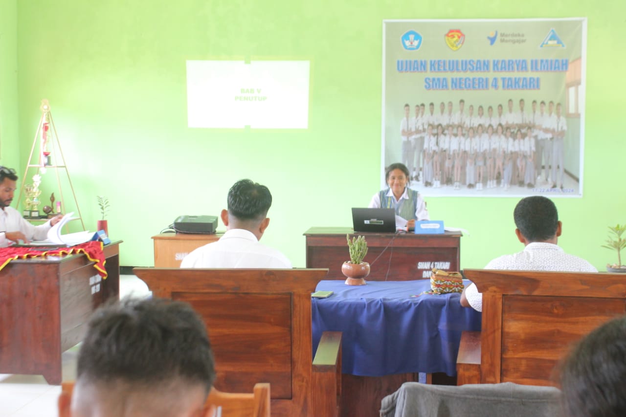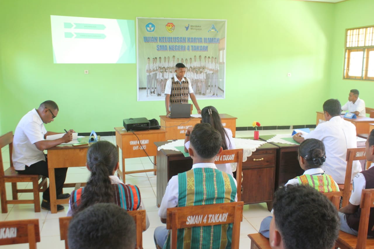 "Peserta didik SMA Negeri 4 Takari sudah dibekali dengan bagaimana penyusunan KTI sejak kelas X. Materi tentang KTI ada dalam pembelajaran bahasa Indonesia, khususnya di kelas XI dan XII meskipun masih implisit. Selain itu, sekolah harus menyiapkan tambahan buku panduan menulis KTI bagi peserta didik dan untuk mempermudah penyusunan, peserta didik dibimbing oleh satu guru pembimbing sampai ke sidang selama satu semester. Tahun ini, Kami menghadirkan penguji ekternal yang semua kami minta dari luar sebanyak 15 orang untuk menguji 31 peserta didik kami" jelas Nomensen Koib,S.Pd ketua panitia ujian sekolah, jumat, rabu, 19 april 2024) siang.