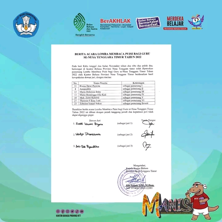 “Lomba Baca Puisi bagi Guru dalam rangka Bulan Bahasa dan Sastra 2022 di Provinsi NTT. Kegiatan ini diselenggarakan oleh Kantor bahasa Provinsi NTT,” ujar Ferry diruang kerjanya, Sabtu (5/11/2022)